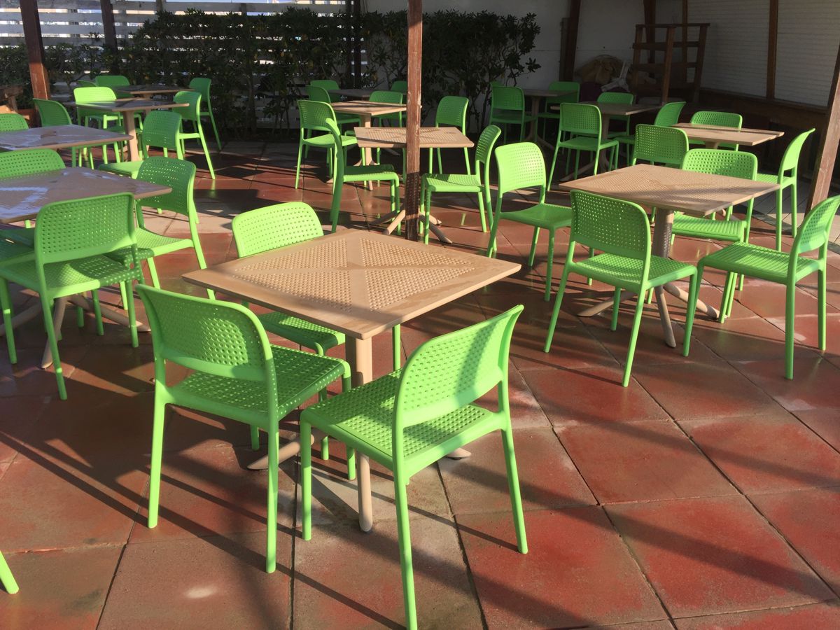 Для использования мебели в данном кафе, был выбран комплект мебели созданный специально для коммерческого применения. И им оказался набор ROZES, комплект не занимающий много места и отлично справляющийся с задачей размещения большого количества людей на небольшой территории. Это мебель которая не выгорает и не деформируется от солнечных лучей и палящего солнца. И к тому-же она устойчива к высокой влажности и к низкой температуре.