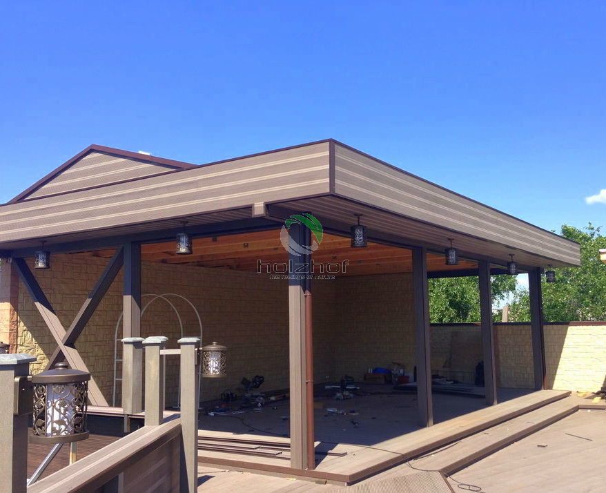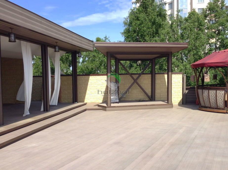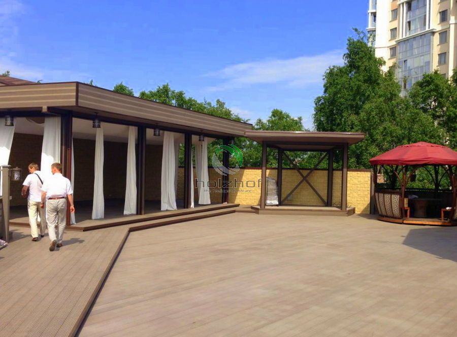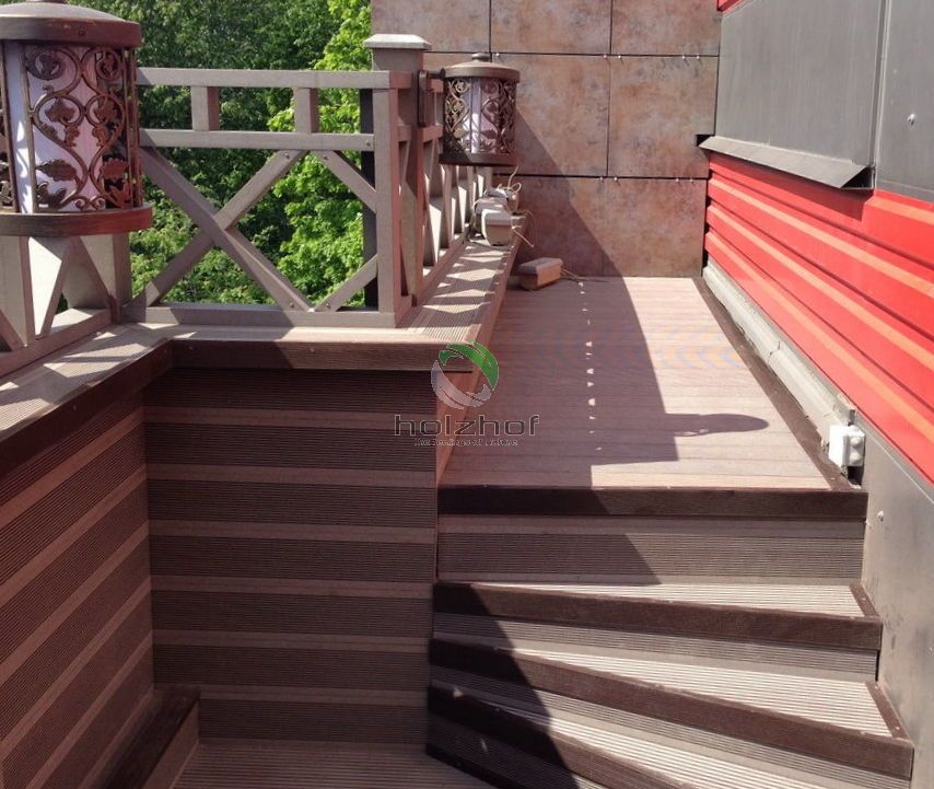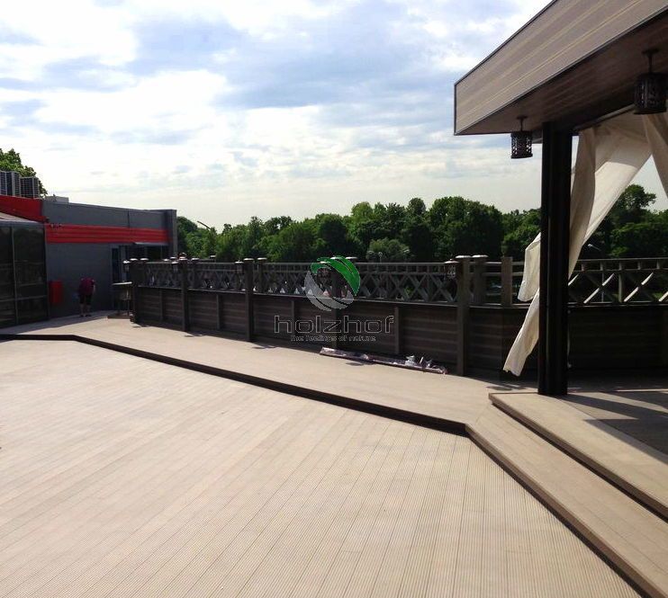 Монтаж был осуществлен бригадой наших монтажников. Все стационарные элементы конструкций, таких как веранда, парапеты, переходы, лестницы столбы и т.п. были обшиты именно террасной доской ДПК Holzhof. Обращаем Ваше внимание, что именно эта доска имеет целый ряд преимуществ для использования ее на коммерческих объектах: