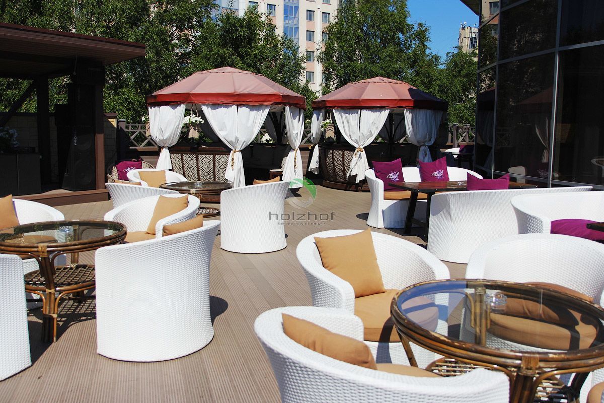 В городе на Неве, там где так трудно найти свободные квадратные метры для организации кафе или ресторана, на эксплуатируемой кровле "расположился" ресторан Бали, где в качестве террасного покрытия, применена бесшовная террасная доска holzhof.
