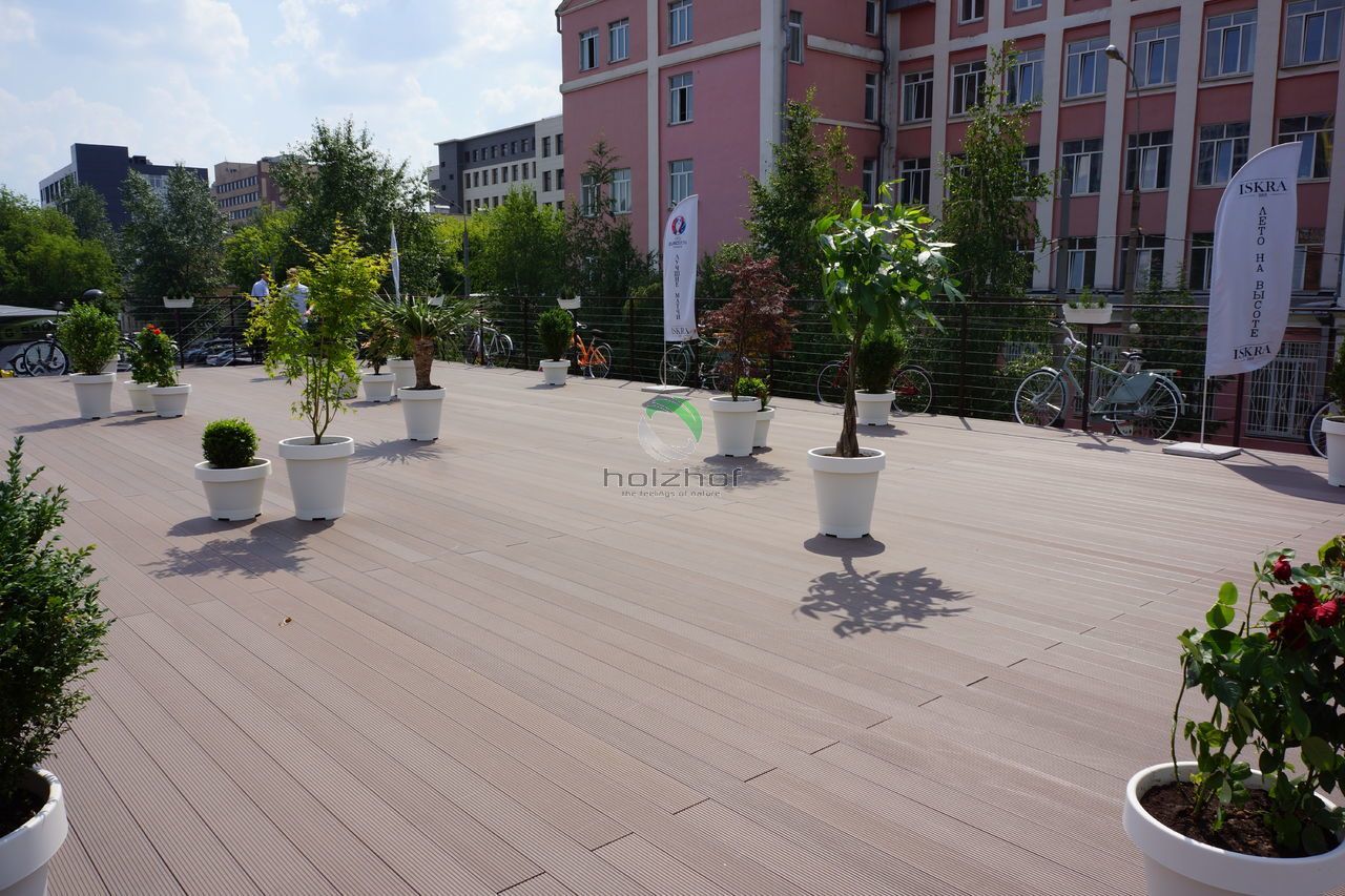 Проходимость с барах Москвы очень большая, и не каждое покрытие пола выдержит бурные выходные с танцами девушек на каблуках. В кафе - бар «Искра» смонтирована качественная террасная доска, которая выдержит не только большой поток посетителей, танцы на каблуках но и погодные перемены на открытой террасе. Проведя предварительную работу, была выбрана шовная террасная доска на регулируемых опорах , отлично подходящая по всем характеристикам. Теперь посетители бара, смогут весело и комфортно отдыхать.